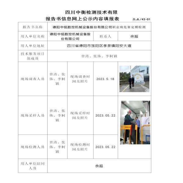 德阳中铭数控机械设备股份有限公司职业病危害定期检测