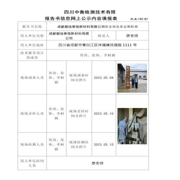 成都顺佳美恒新材料有限公司职业病危害定期检测