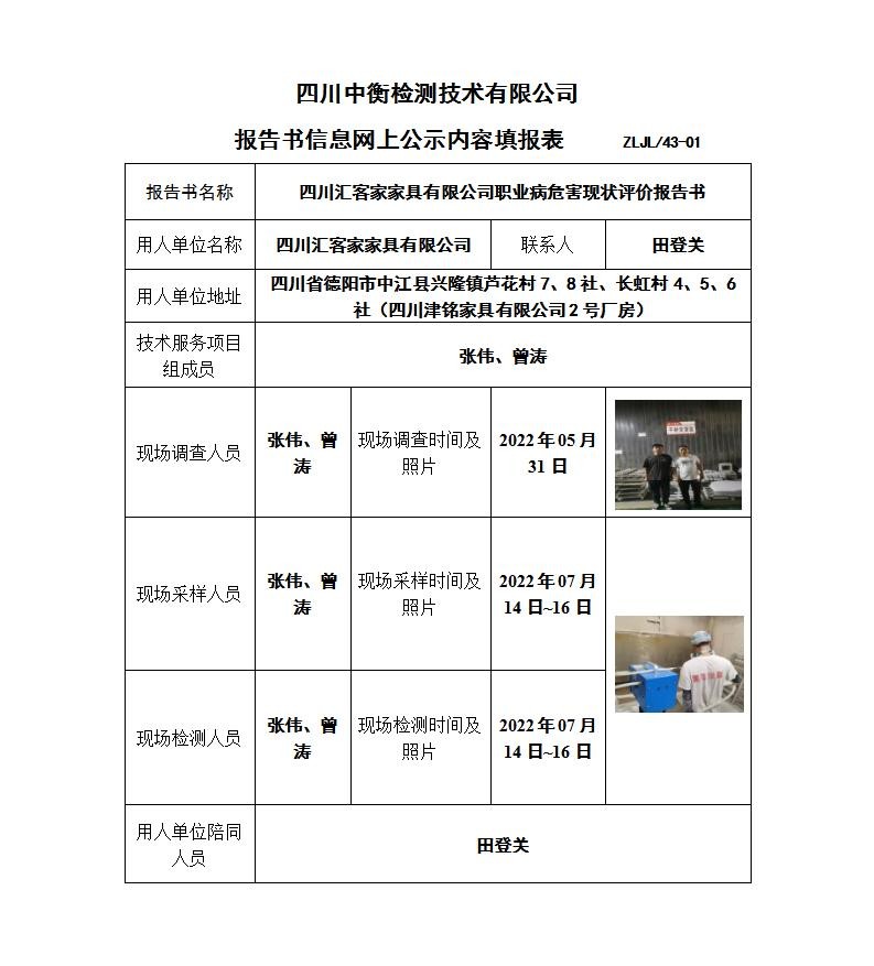 四川汇客家家具有限公司职业病危害现状评价