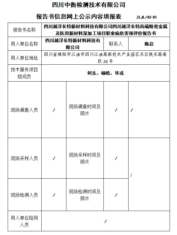 四川越洋长特新材料科技有限公司四川越洋长特高端精密金属 及医用新材料深加工项目预评价