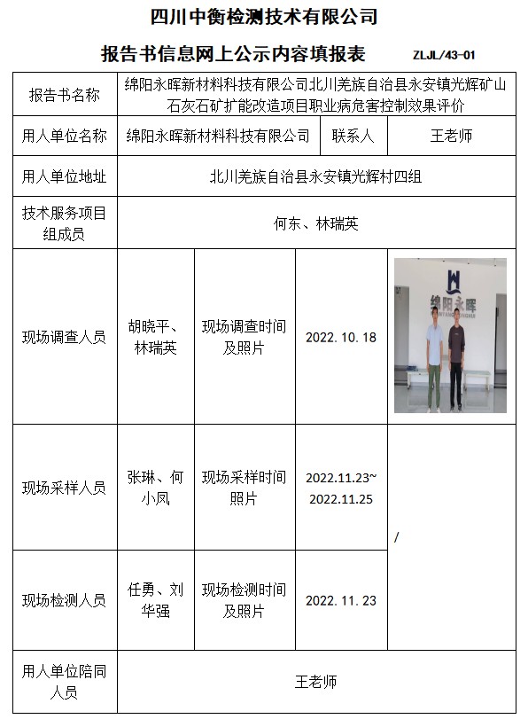 绵阳永晖新材料科技有限公司北川羌族自治县永安镇光辉矿山 石灰石矿扩能改造项目控制效果评价