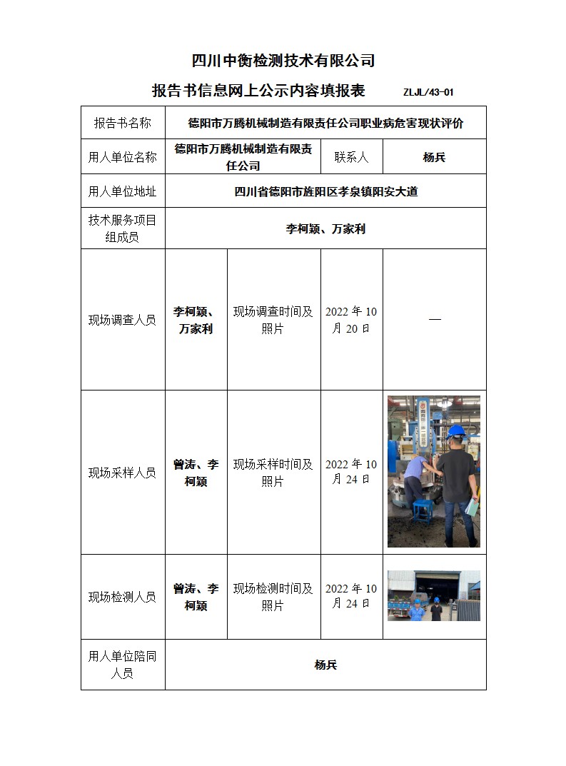 德阳市万腾机械制造有限责任公司 职业病危害现状评价报告书