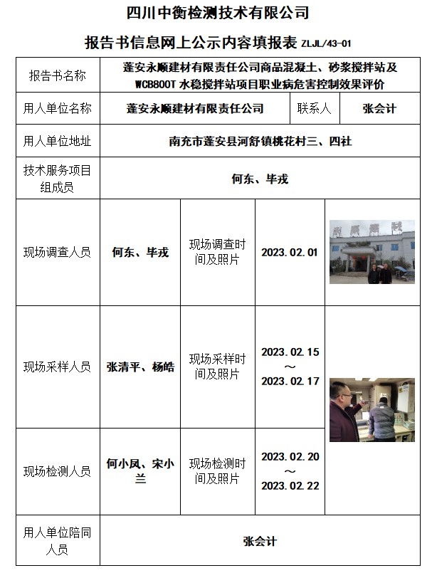 蓬安永顺建材有限责任公司商品混凝土、砂浆搅拌站及WCB800T水稳搅拌站项目控制效果评价