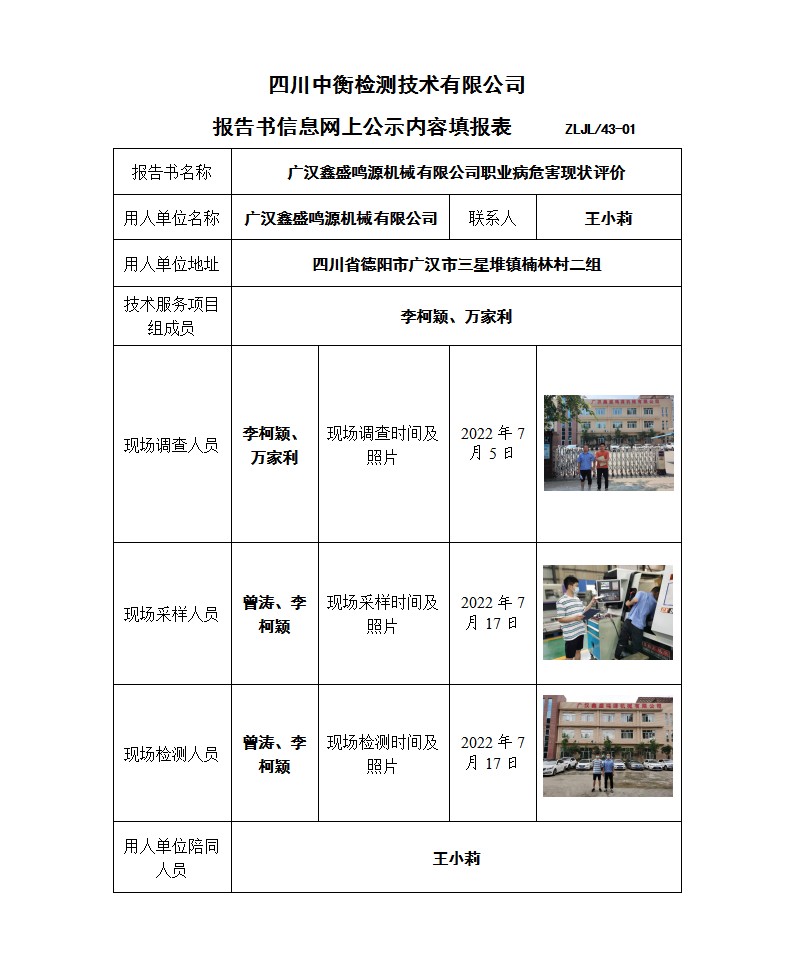 广汉鑫盛鸣源机械有限公司 职业病危害现状评价报告书