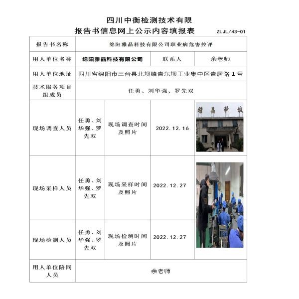 绵阳雅晶科技有限公司定期检测