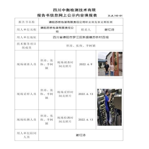 德阳苏桥包装有限责任公司职业病危害定期检测