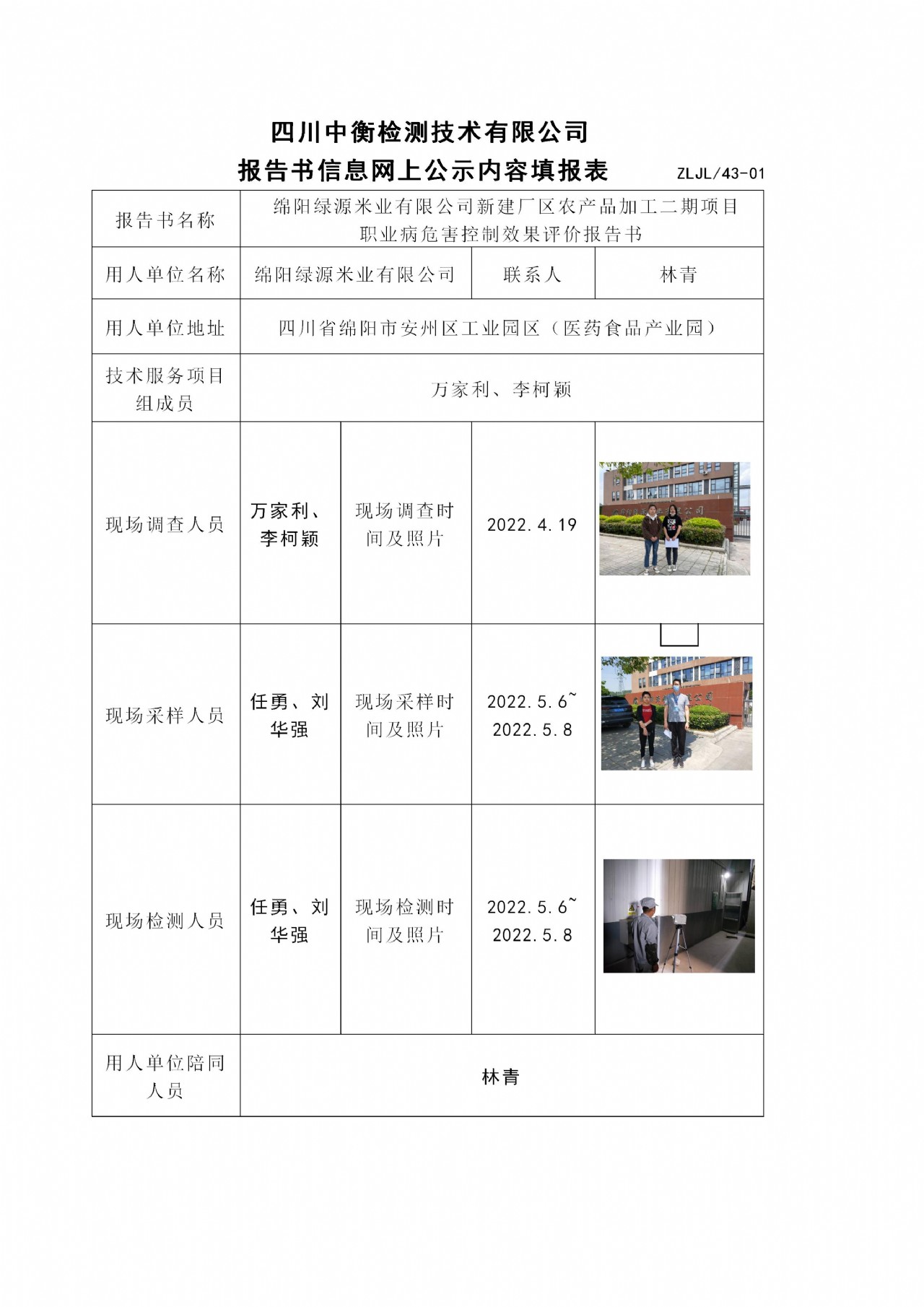 绵阳绿源米业有限公司新建厂区农产品加工二期项目 职业病危害控制效果评价