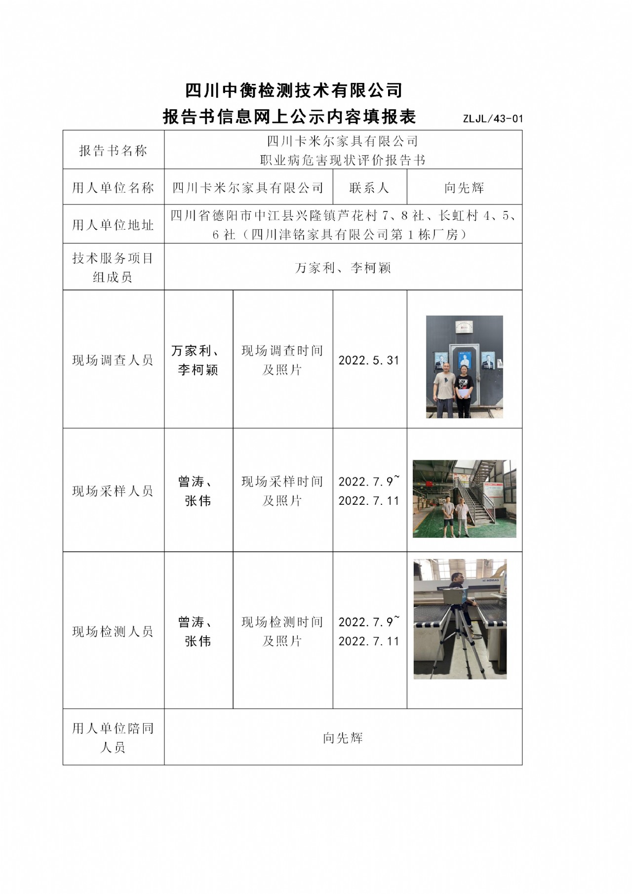 四川卡米尔家具有限公司 职业病危害现状评价