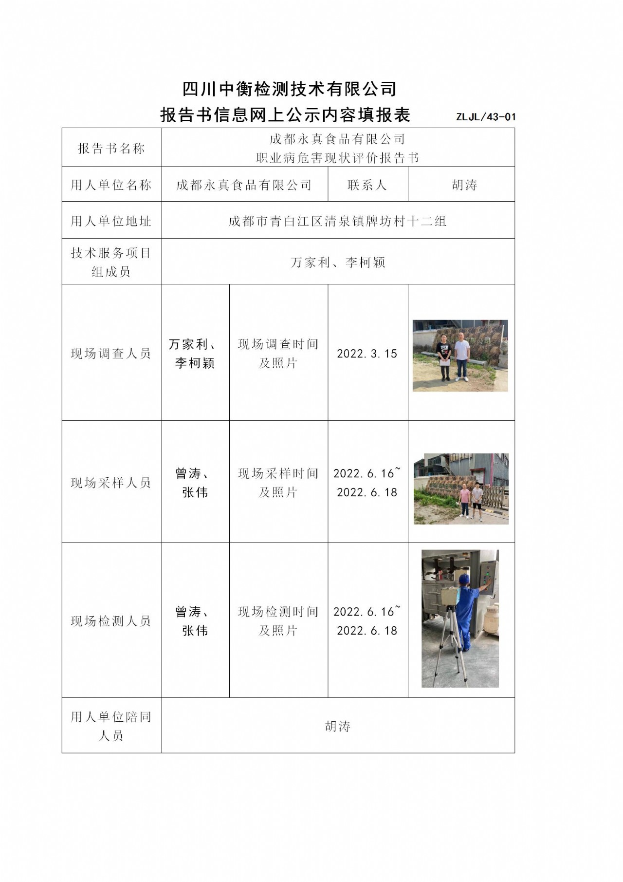 成都永真食品有限公司 职业病危害现状评价