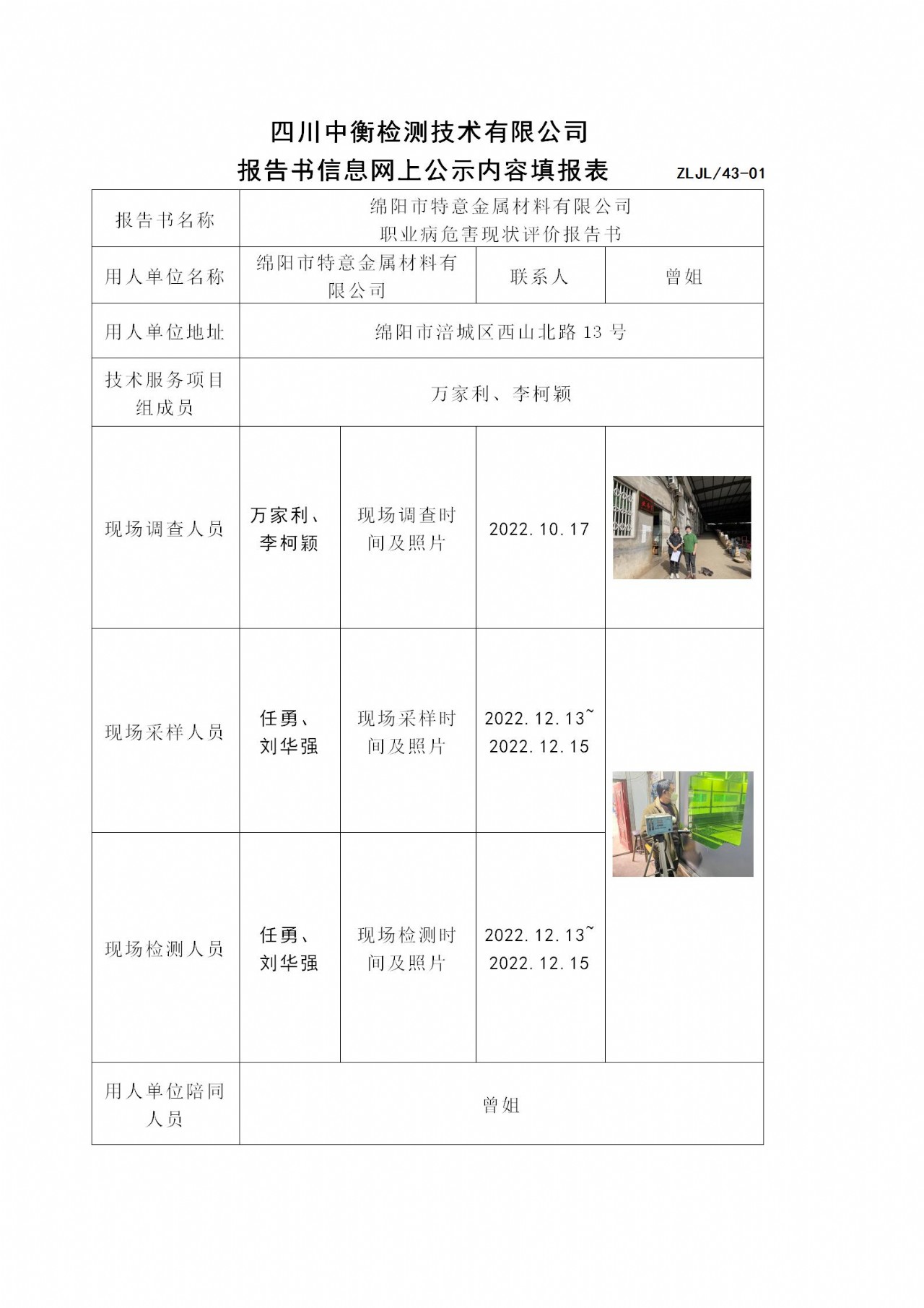 绵阳市特意金属材料有限公司 职业病危害现状评价
