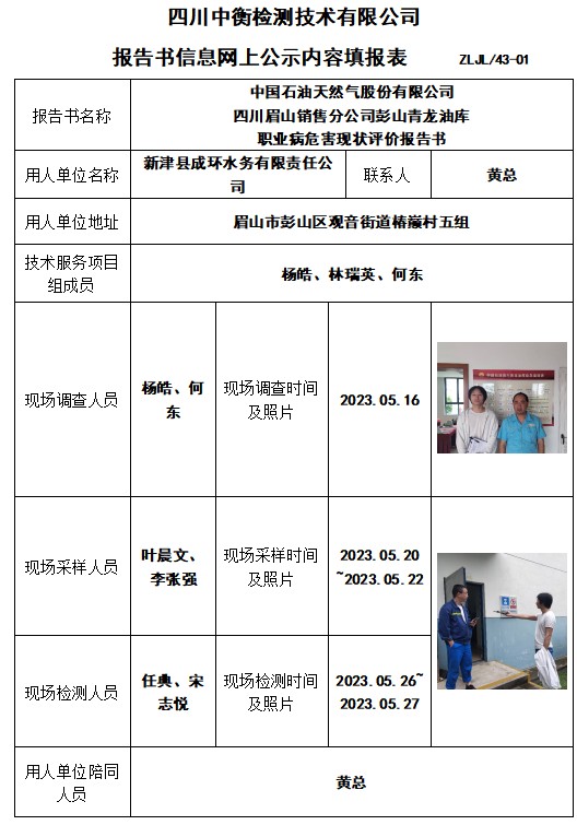 中国石油天然气股份有限公司 四川眉山销售分公司彭山青龙油库 职业病危害现状评价报告书