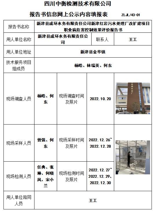 新津县成环水务有限责任公司新津红岩污水处理厂改扩建项目 职业病危害控制效果评价报告书