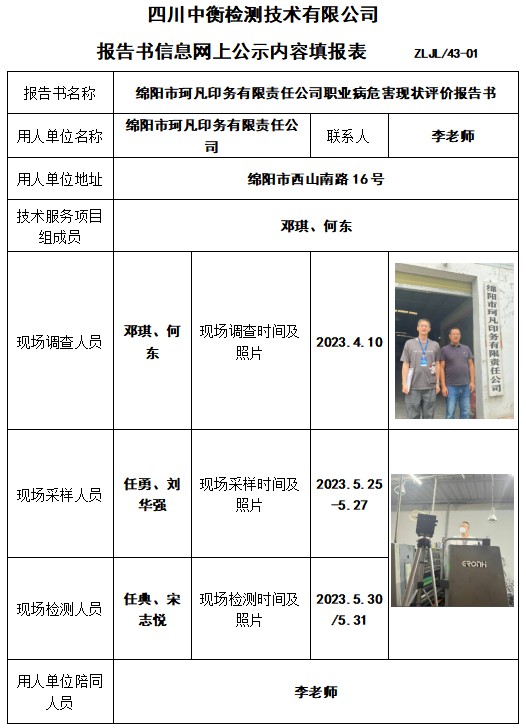 绵阳市珂凡印务有限责任公司职业病危害现状评价报告书