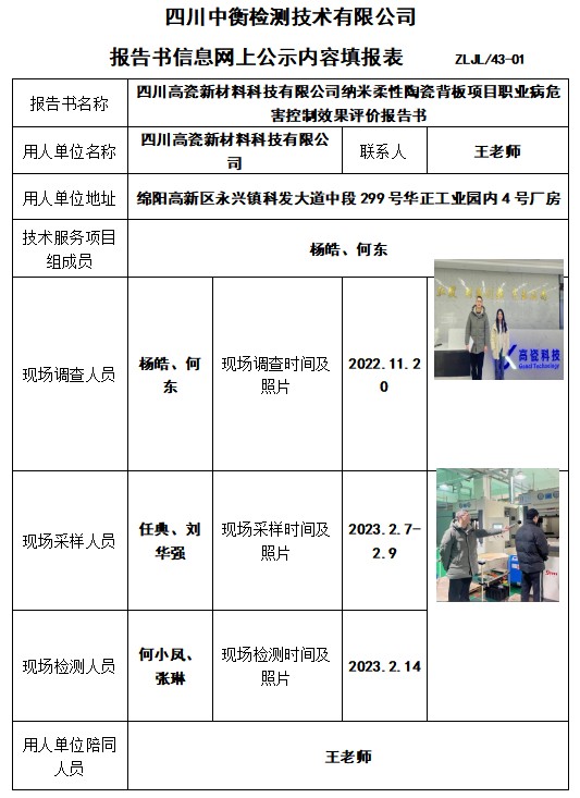四川高瓷新材料科技有限公司纳米柔性陶瓷背板项目职业病危害控制效果评价报告书