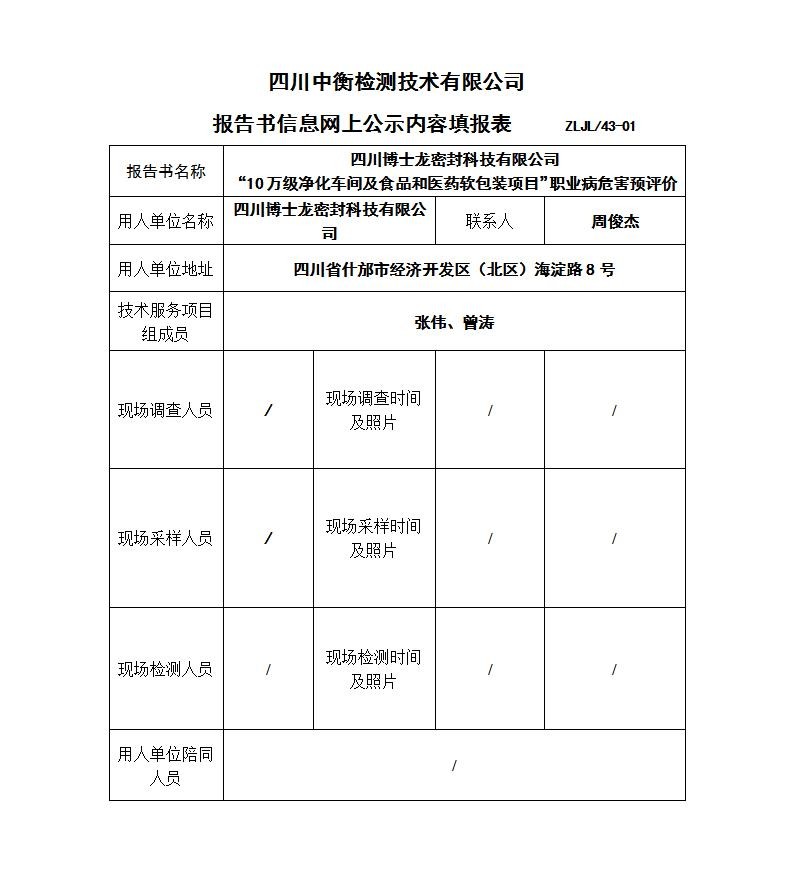 四川博士龙密封科技有限公司“10万级净化车间及食品和医药软包装项目” 职业病危害预评价