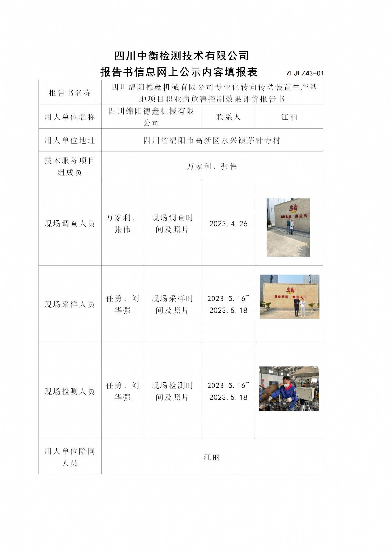 四川绵阳德鑫机械有限公司专业化转向传动装置生产基地项目职业病危害控制效果评价