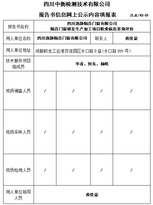 四川逸静隔音门窗有限公司 隔音门窗研发生产加工项目职业病危害预评价