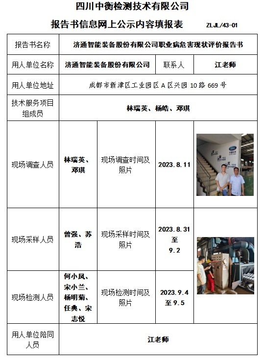 济通智能装备股份有限公司职业病危害现状评价报告书