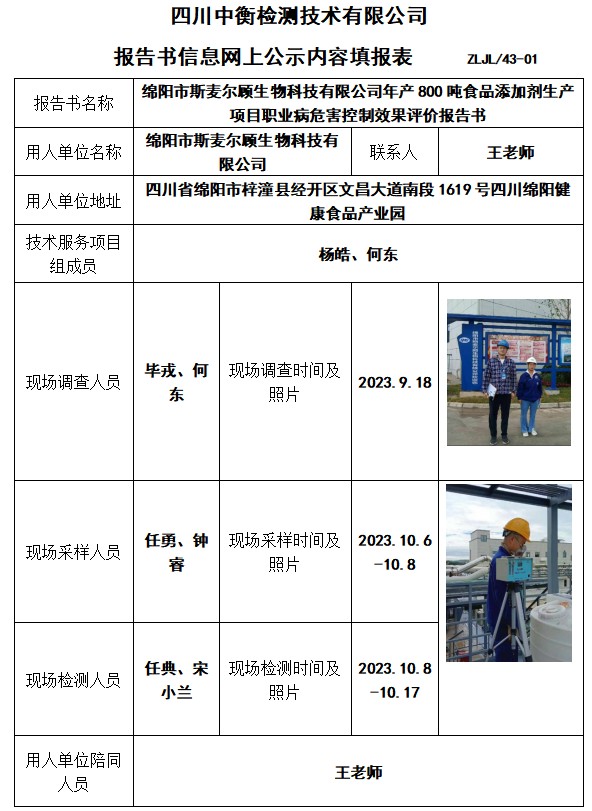 绵阳市斯麦尔顾生物科技有限公司年产800吨食品添加剂生产项目职业病危害控制效果评价报告书