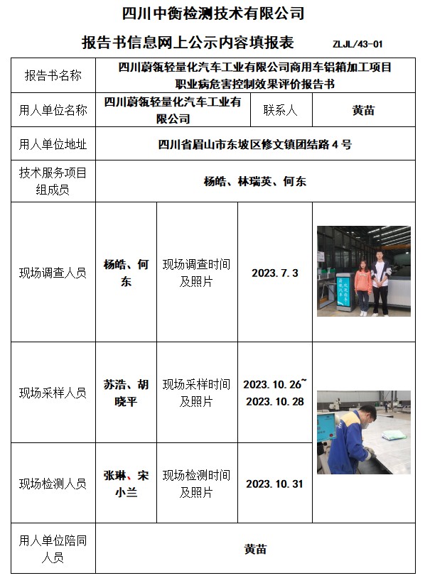 四川蔚瓴轻量化汽车工业有限公司商用车铝箱加工项目 职业病危害控制效果评价报告书