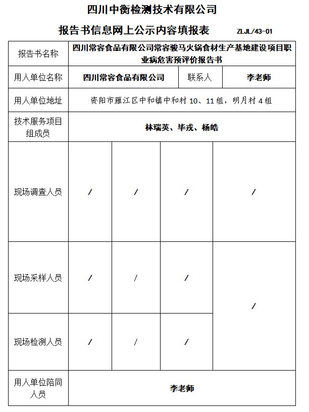 四川常容食品有限公司常容骏马火锅食材生产基地建设项目职业病危害预评价报告书