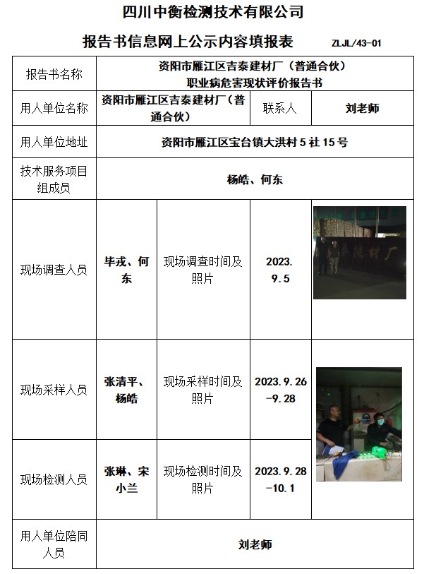资阳市雁江区吉泰建材厂(普通合伙) 职业病危害现状评价报告书