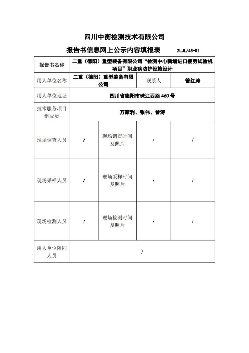 二重(德阳)重型装备有限公司“检测中心新增进口疲劳试验机项目”职业病防护设施设计