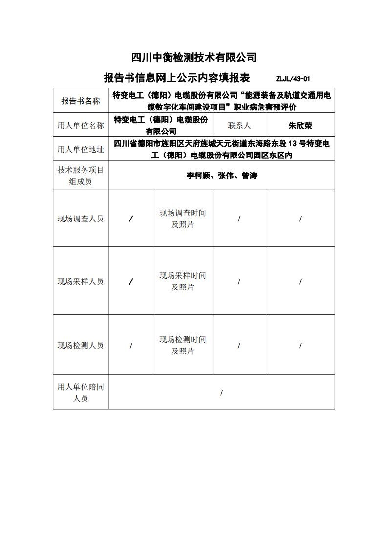 特变电工(德阳)电缆股份有限公司“能源装备及轨道交通用电缆数字化车间建设项目”职业病危害预评价