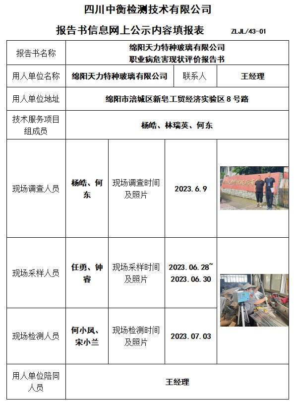 绵阳天力特种玻璃有限公司 职业病危害现状评价报告书