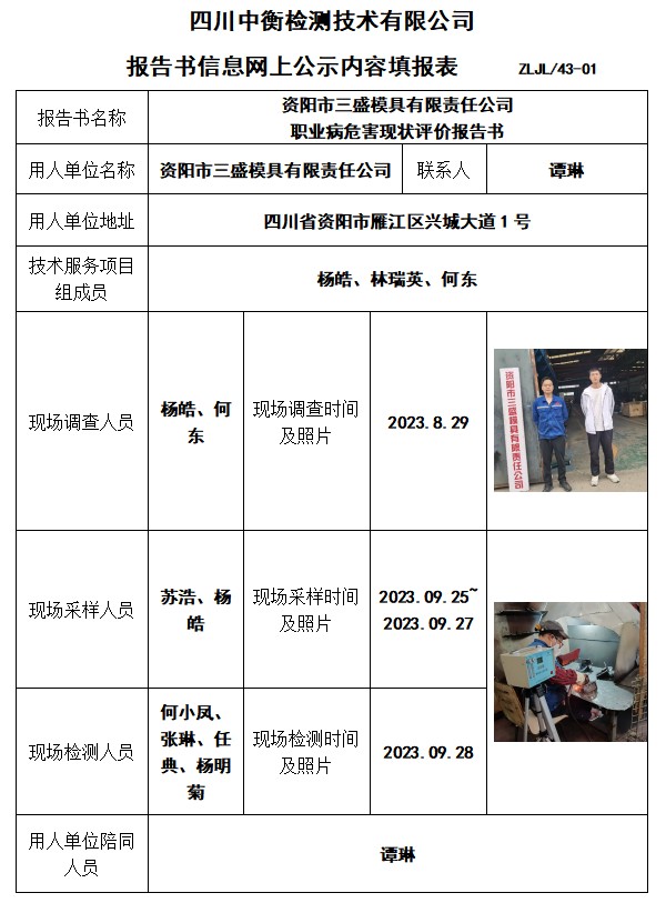 资阳市三盛模具有限责任公司 职业病危害现状评价报告书