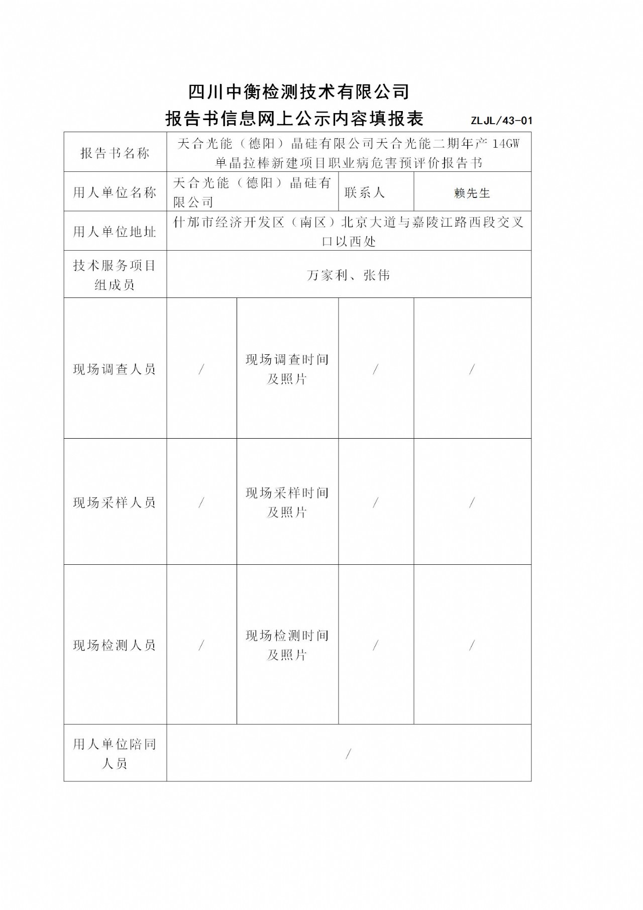 天合光能(德阳)晶硅有限公司天合光能二期年产14GW单晶拉棒新建项目职业病危害预评价