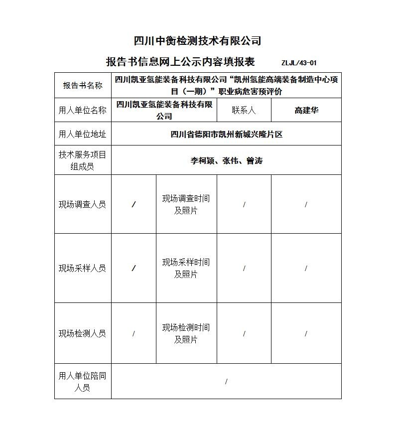 四川凯亚氢能装备科技有限公司“凯州氢能高端装备制造中心项目(一期)”职业病危害预评价