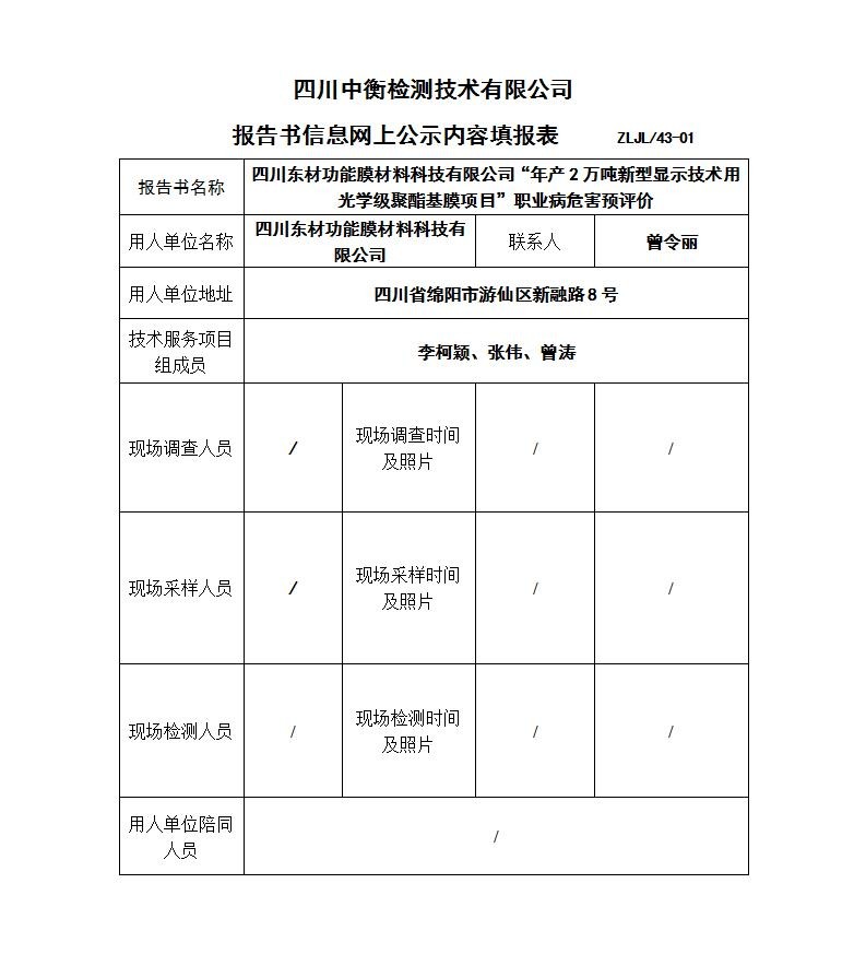 四川东材功能膜材料科技有限公司“年产2万吨新型显示技术用光学级聚酯基膜项目”职业病危害预评价