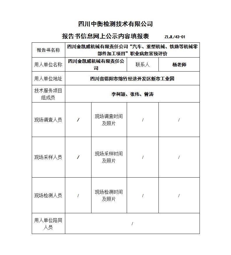 四川金凯威机械有限责任公司“汽车、重型机械、铁路等机械零部件加工项目”职业病危害预评价