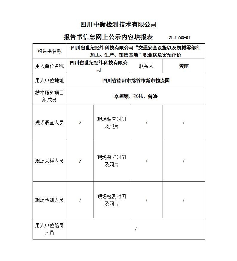 四川省世纪经纬科技有限公司“交通安全设施以及机械零部件加工、生产、销售基地”职业病危害预评价