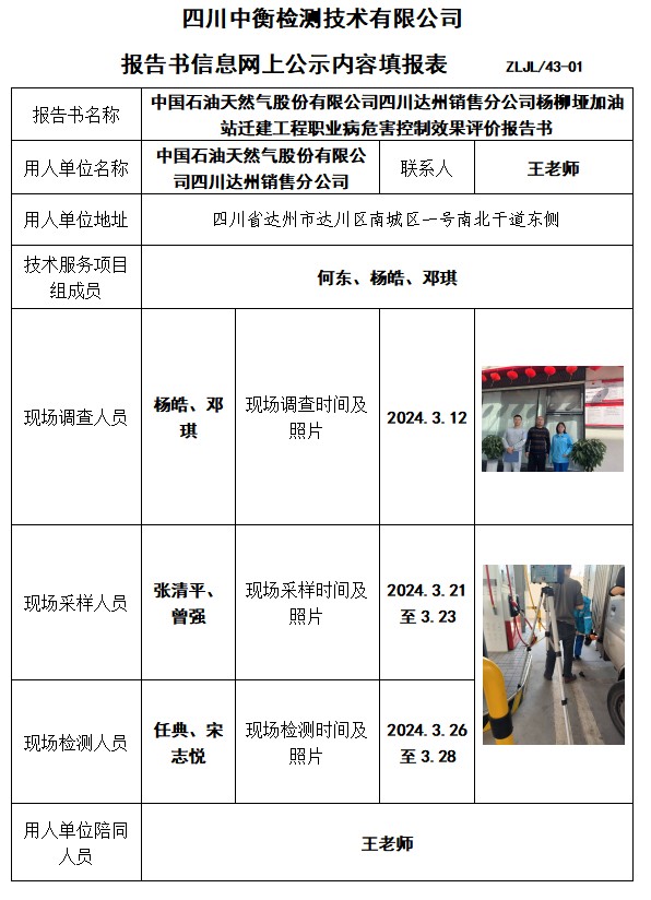 中国石油天然气股份有限公司四川达州销售分公司杨柳垭加油站迁建工程职业病危害控制效果评价报告书