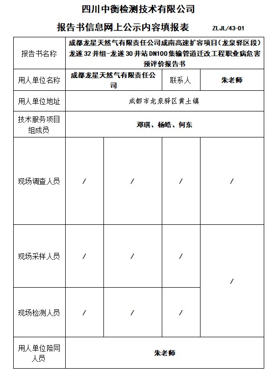 成都龙星天然气有限责任公司 成南高速扩容项目(龙泉驿区段)龙遂32井组-龙遂30井站DN100集输管道迁改工程 职业病危害预评价报告书