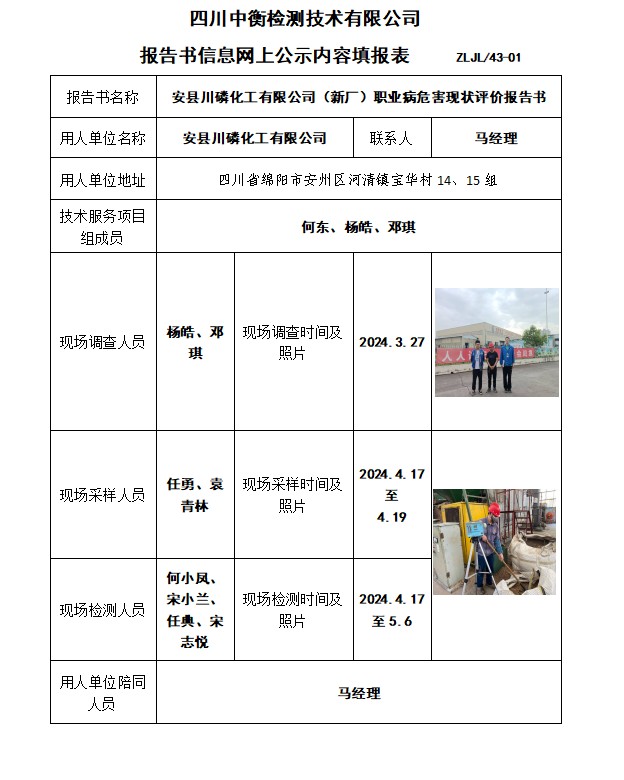 安县川磷化工有限公司(新厂)职业病危害现状评价报告书
