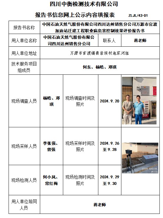 中国石油天然气股份有限公司四川达州销售分公司万源市官渡加油站迁建工程职业病危害控制效果评价报告书