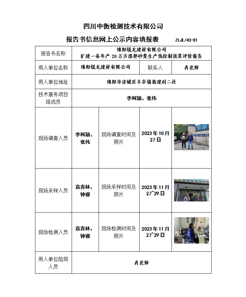 绵阳锐龙建材有限公司 扩建一条年产20万方湿拌砂浆生产线 职业病危害控制效果评价报告书