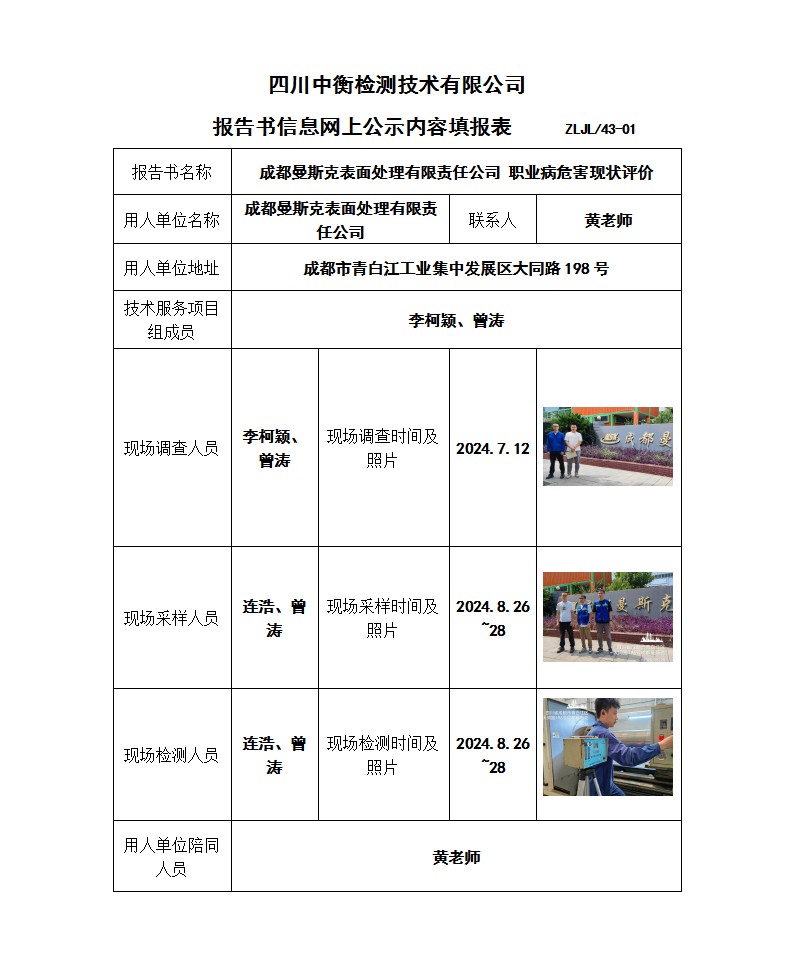 成都曼斯克表面处理有限责任公司 职业病危害现状评价报告书