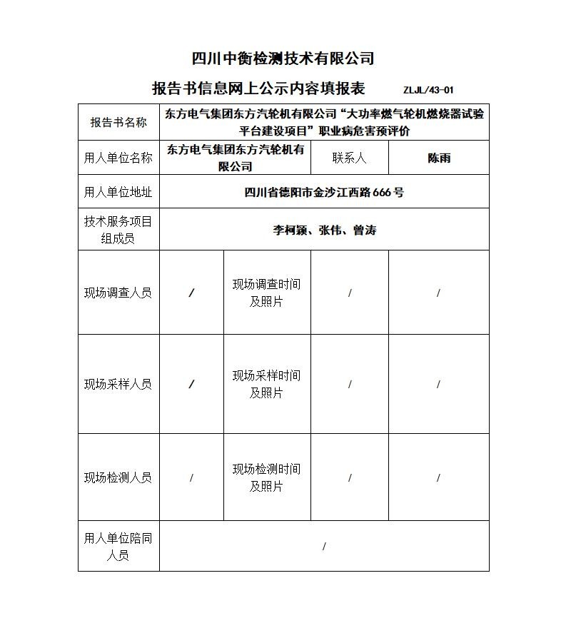 东方电气集团东方汽轮机有限公司“大功率燃气轮机燃烧器试验平台建设项目”职业病危害预评价