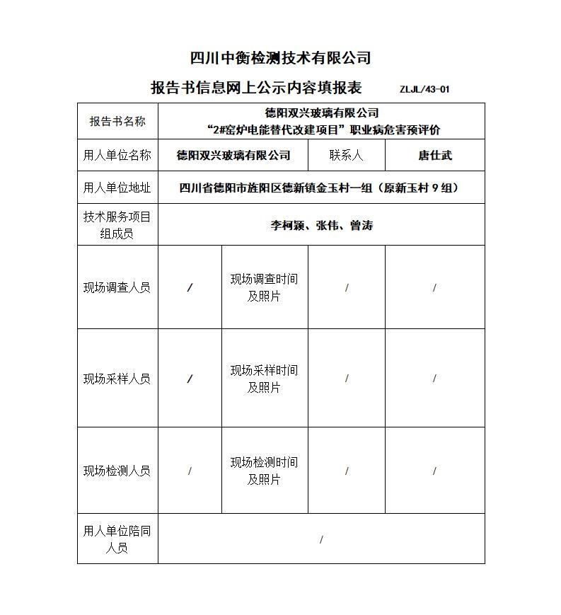德阳双兴玻璃有限公司“2#窑炉电能替代改建项目”职业病危害预评价